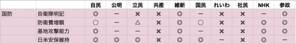まとめの表を見るだけで各党のスタンスや政策方針が全て分かります。