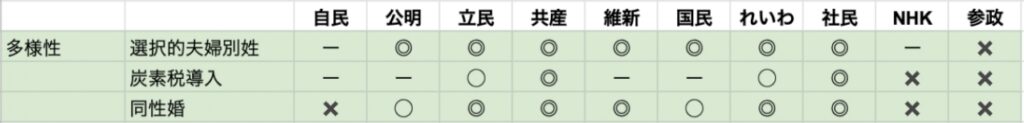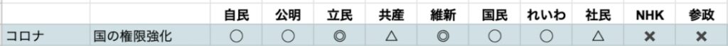 選挙ドットコムがかなり整理された情報(政党アンケート)を公表しているので、そこから独自に過不足なく抜き出して整理しました。