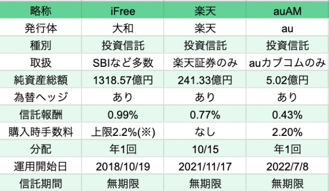 実質コストはiFreeが1.16%ですが、2022年11月時点では楽天、auAMともに不明です。