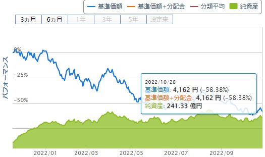 例えば楽天のレバナスに2022年の頭に一括投資した場合、その保有者は-59.7%もの含み損を抱えたことになります。