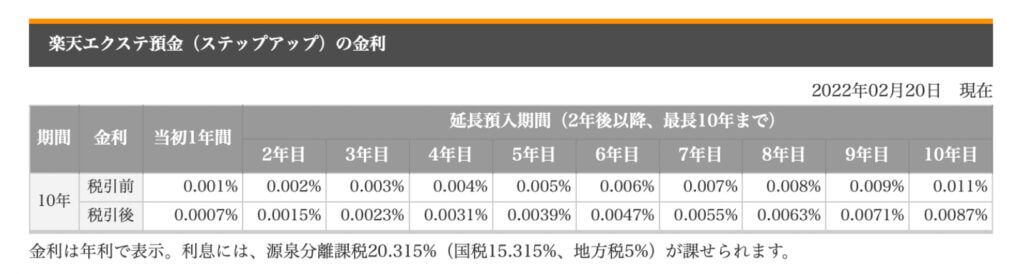 ステップアップ金利に関しては、最初1年が0.001%で1年ごとに0.001%アップ・最終の10年目だけ0.002%アップして0.011%となります。